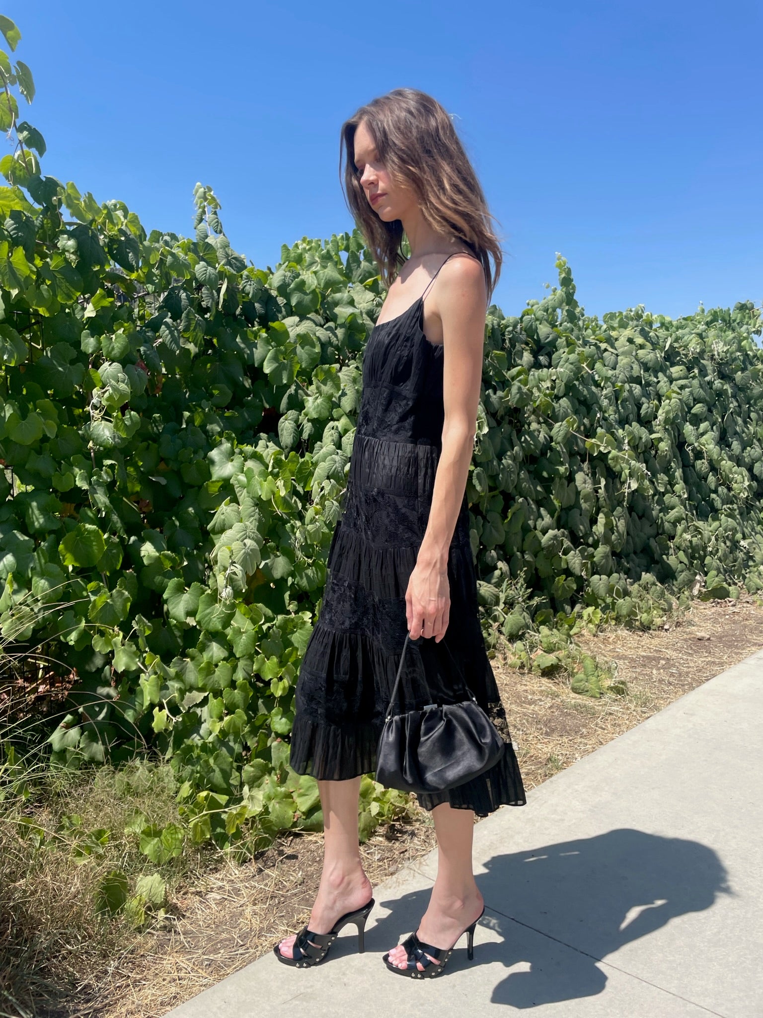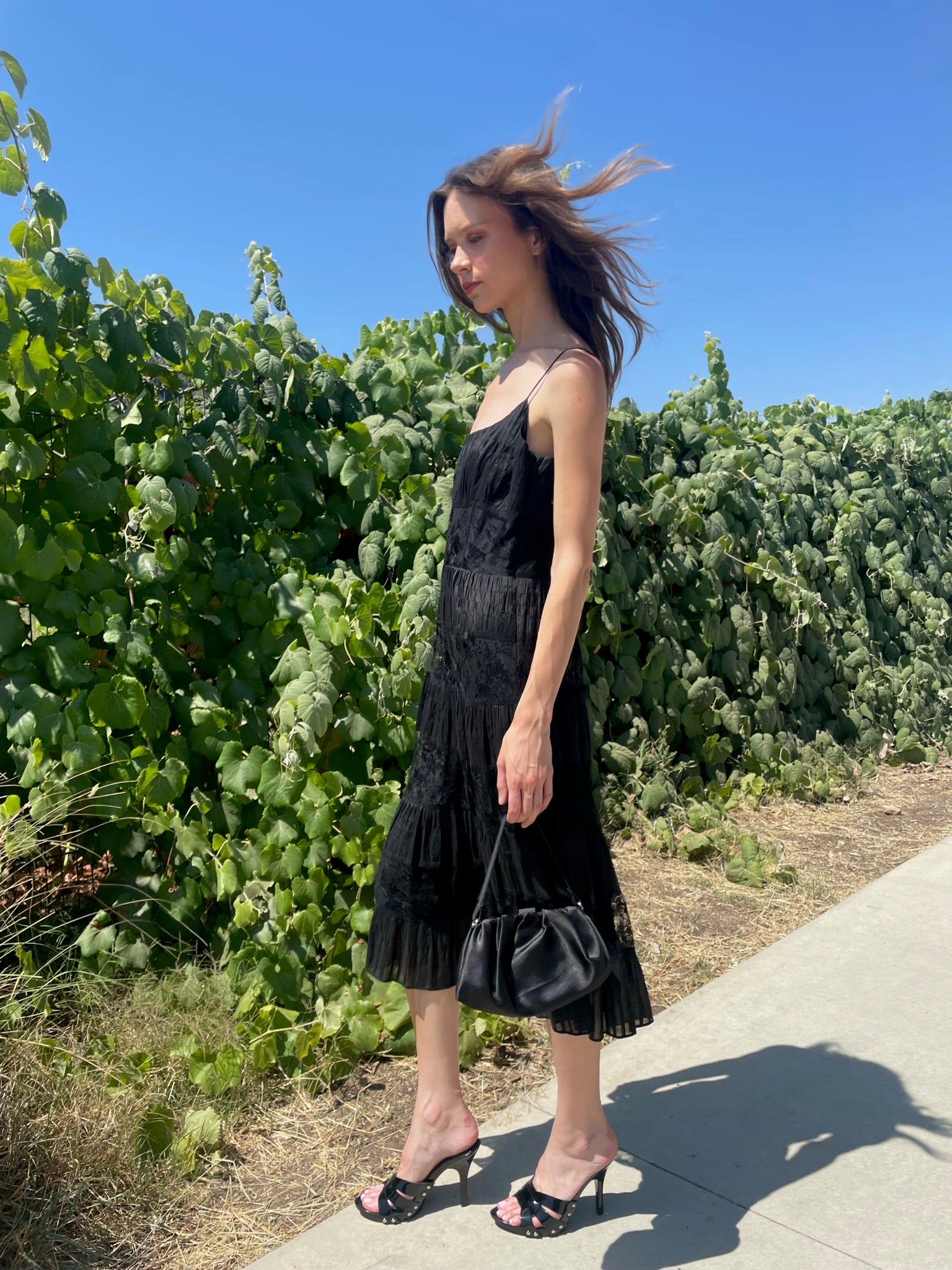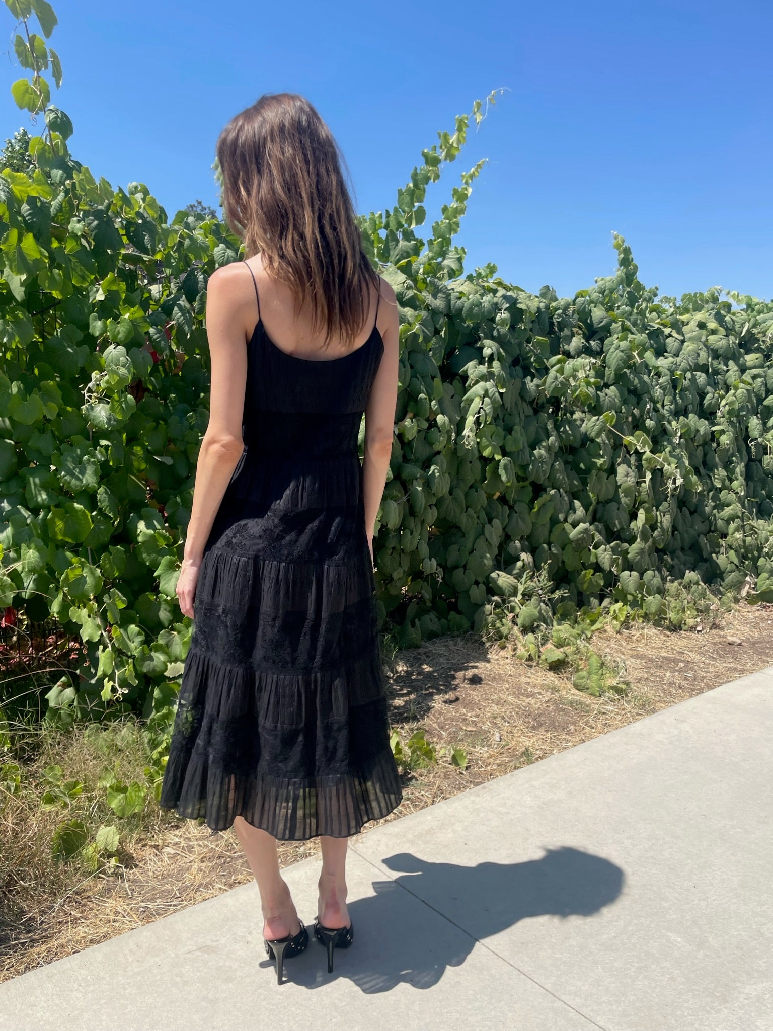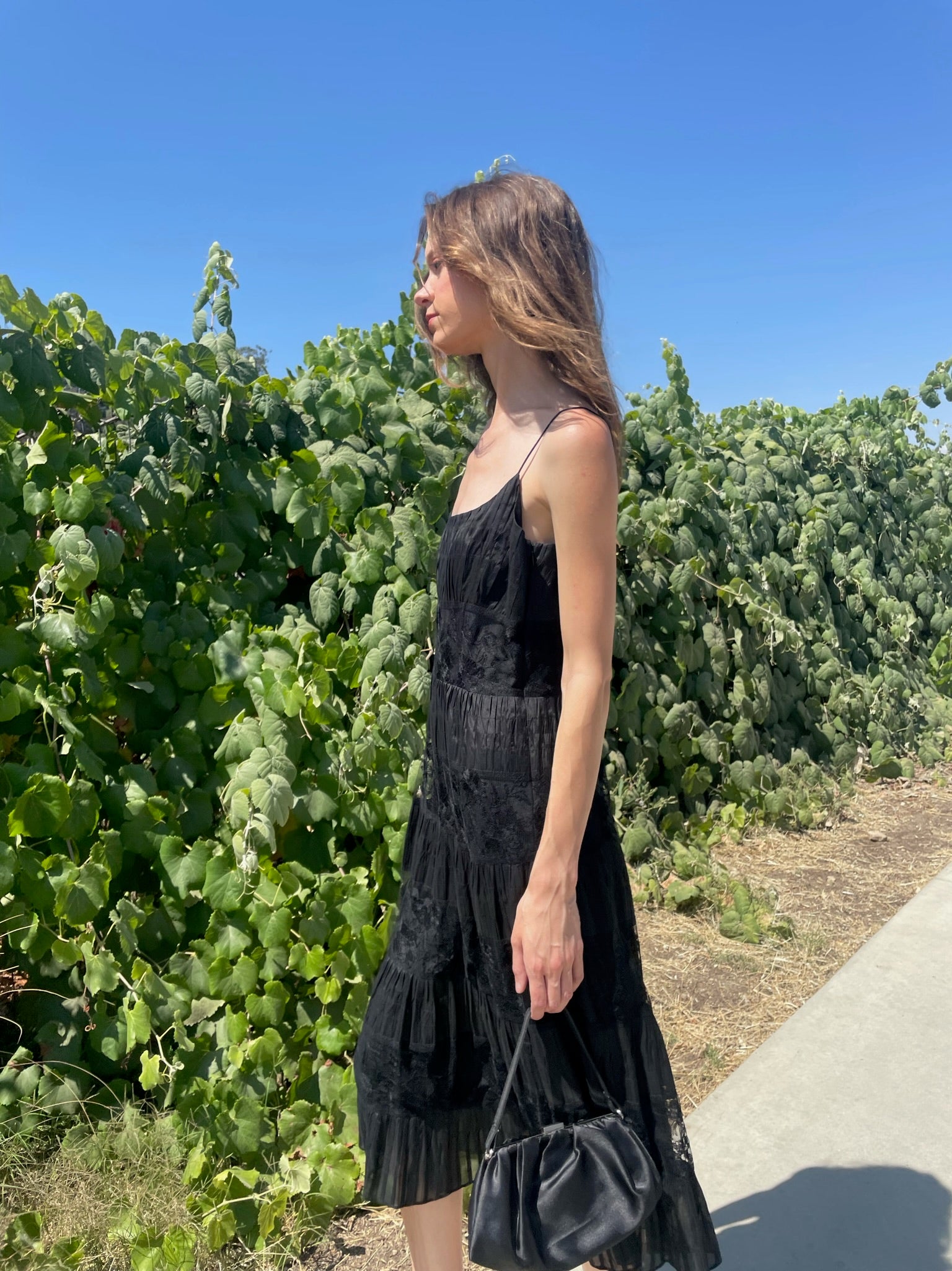 Black lace dress. Spaghetti strap detail lace stacked detail. Relaxed fit.