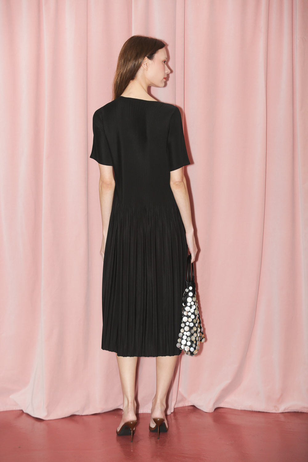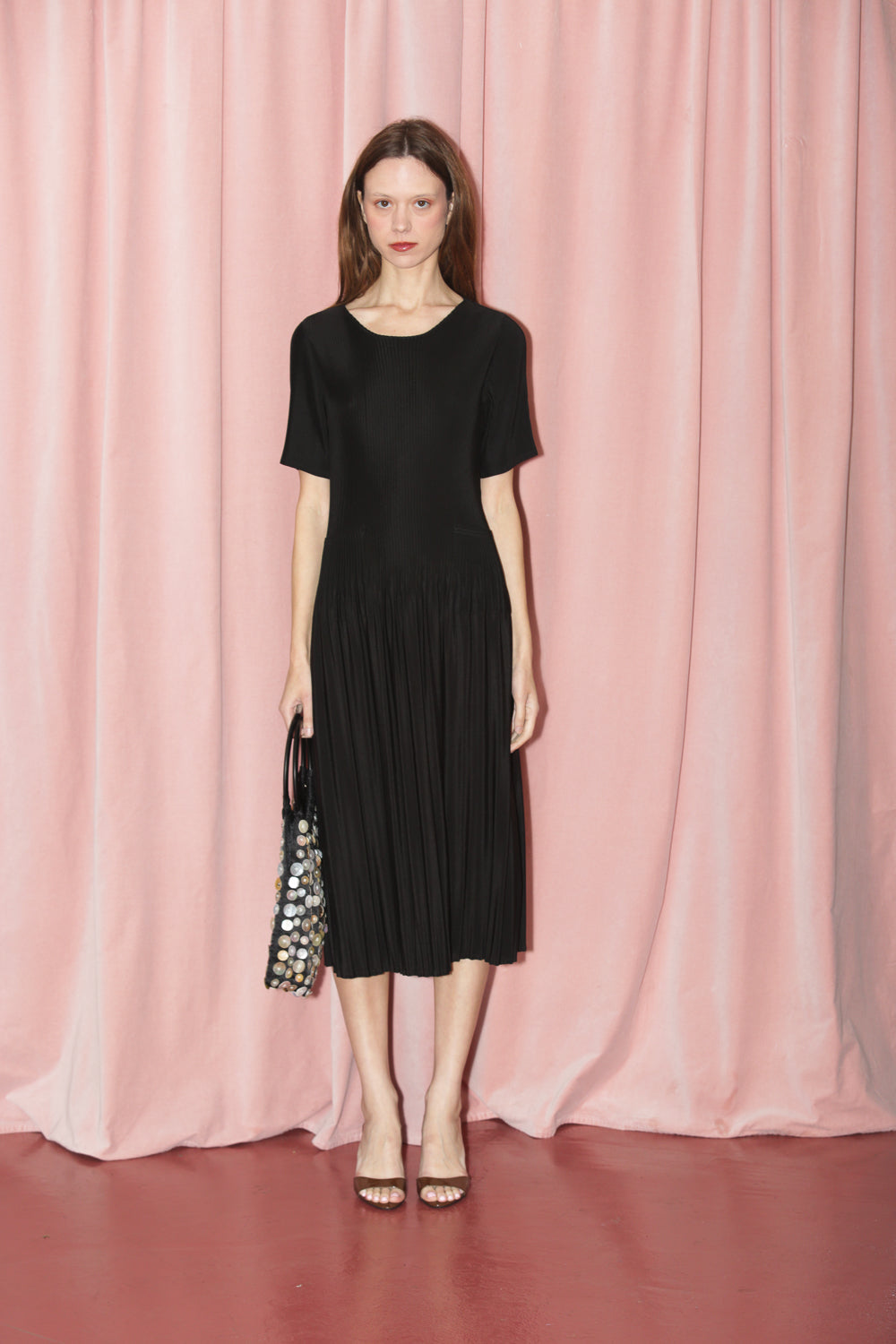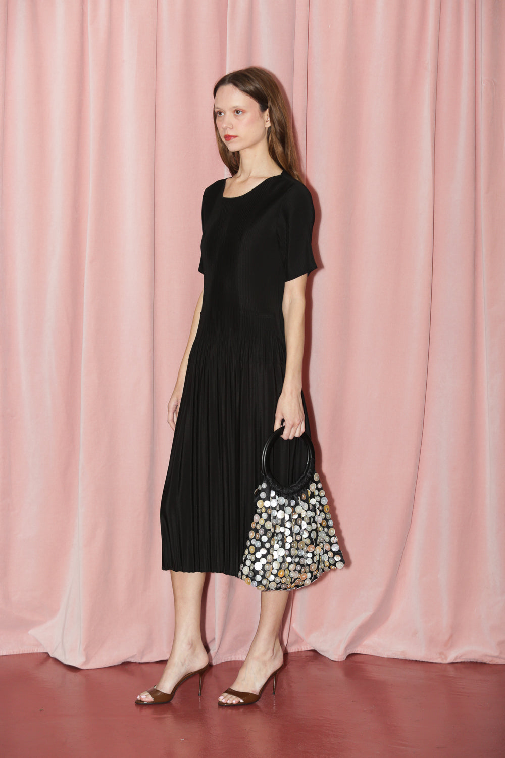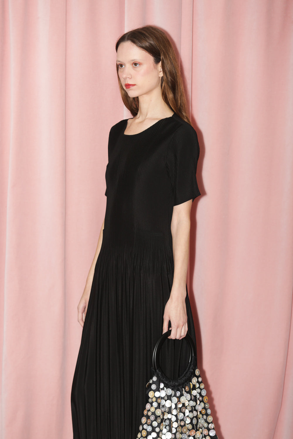 Black slip dress. Pleated throughout. Two front side pockets. Stretchy relaxed fit.