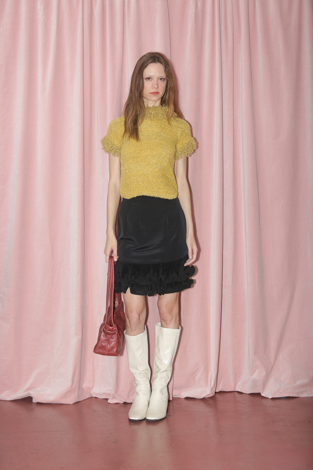 Vintage black ruffle pencil skirt. Fitted and flared bottom hem ruffle detail. Side zipper closure.