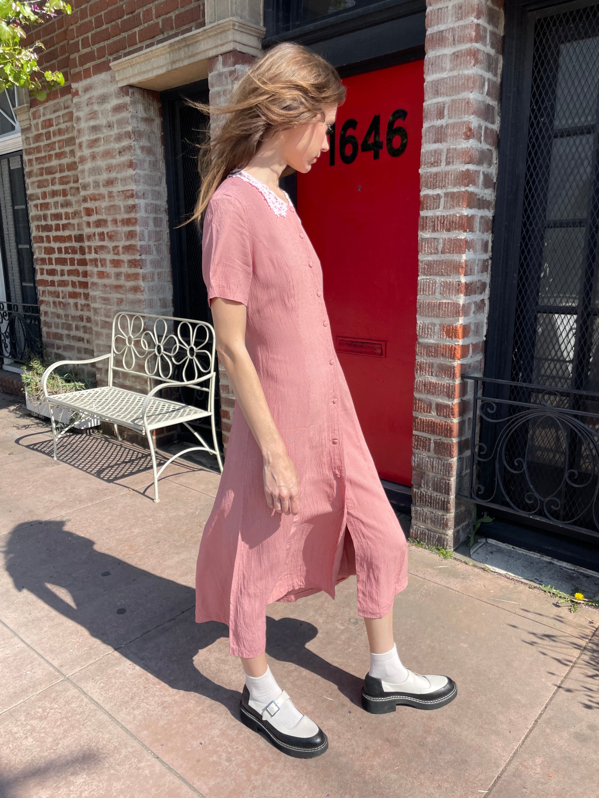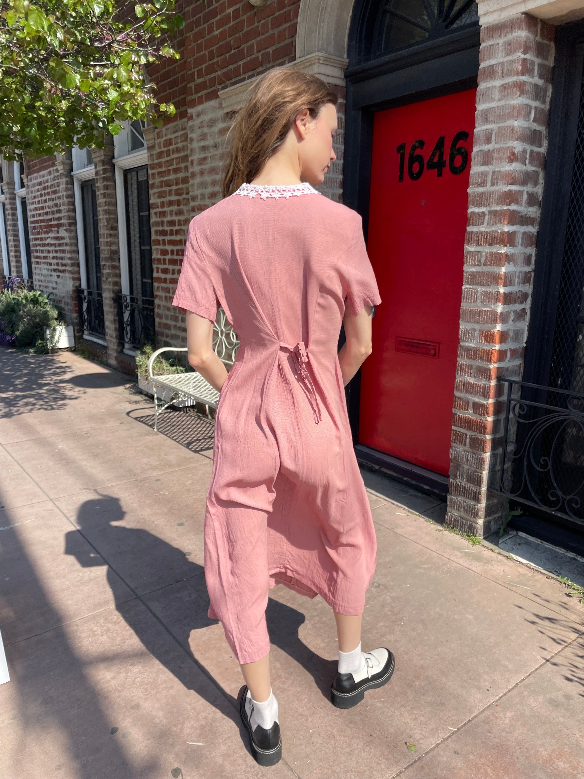 Vintage red gingham dress. Beautiful whit lace collar detailing throughout the neckline. Front button down down closure. Adjustable back cinch tie. Relaxed flowy fitted fit.