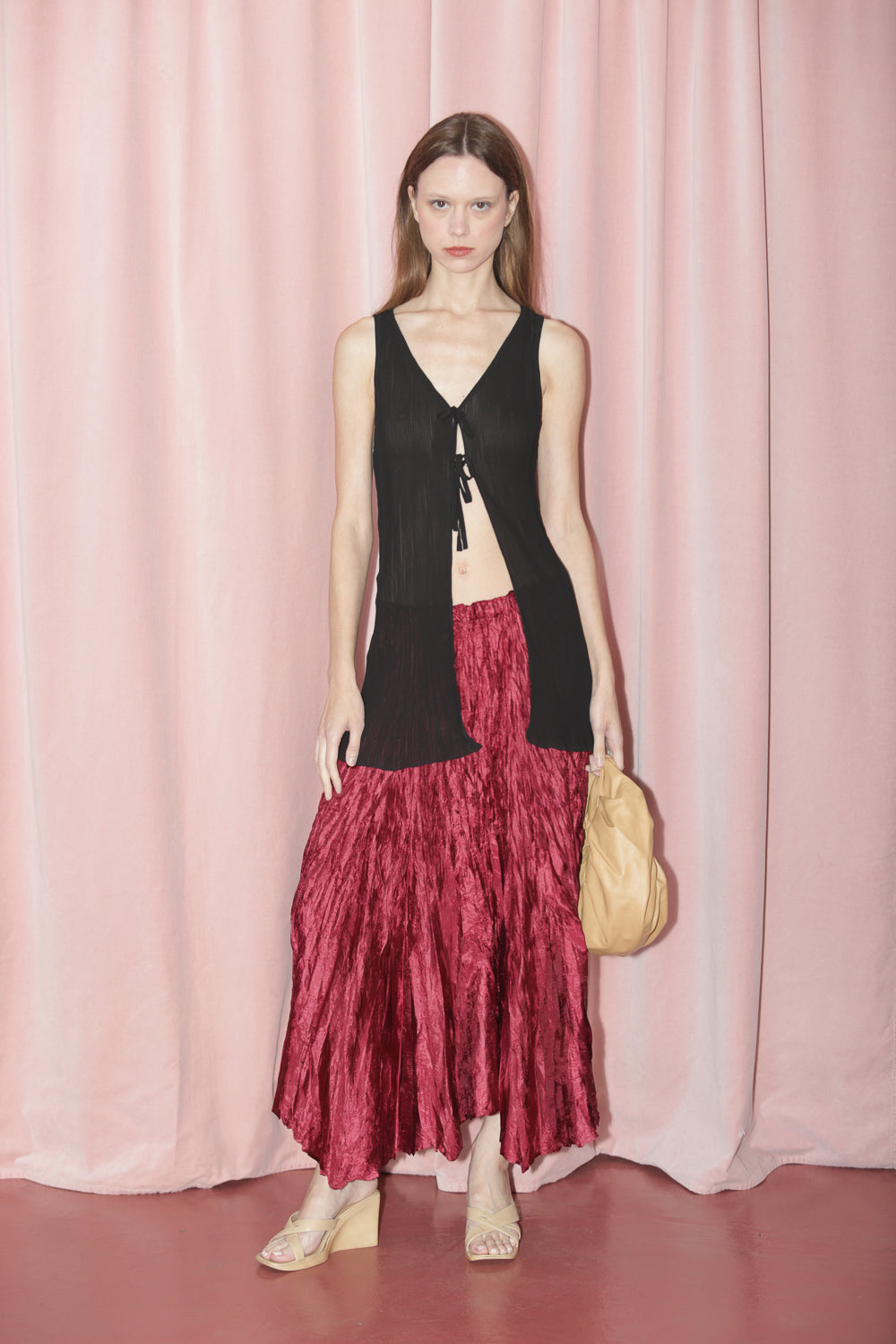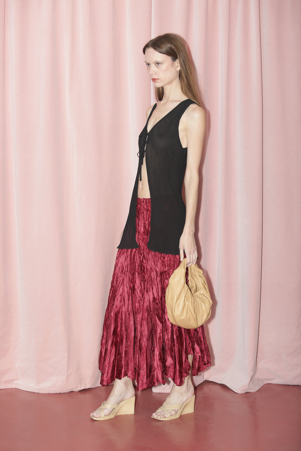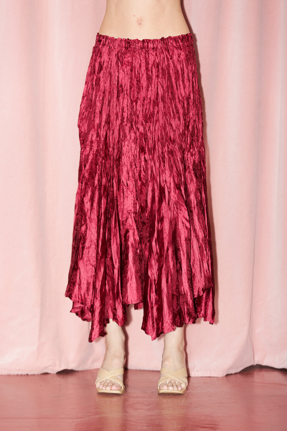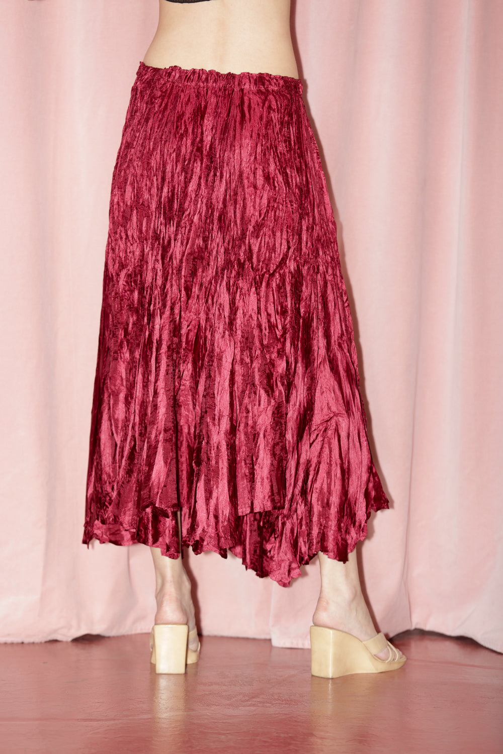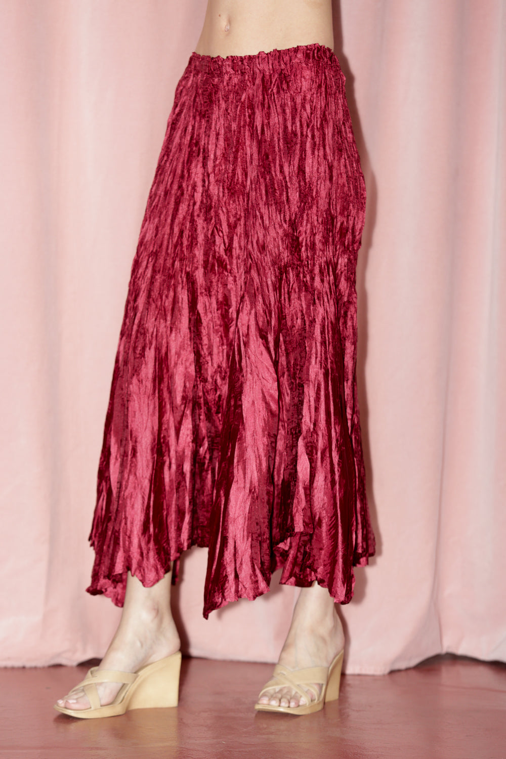 Crimson textured asymmetrical skirt. Elastic waist. Flowy relaxed fit.