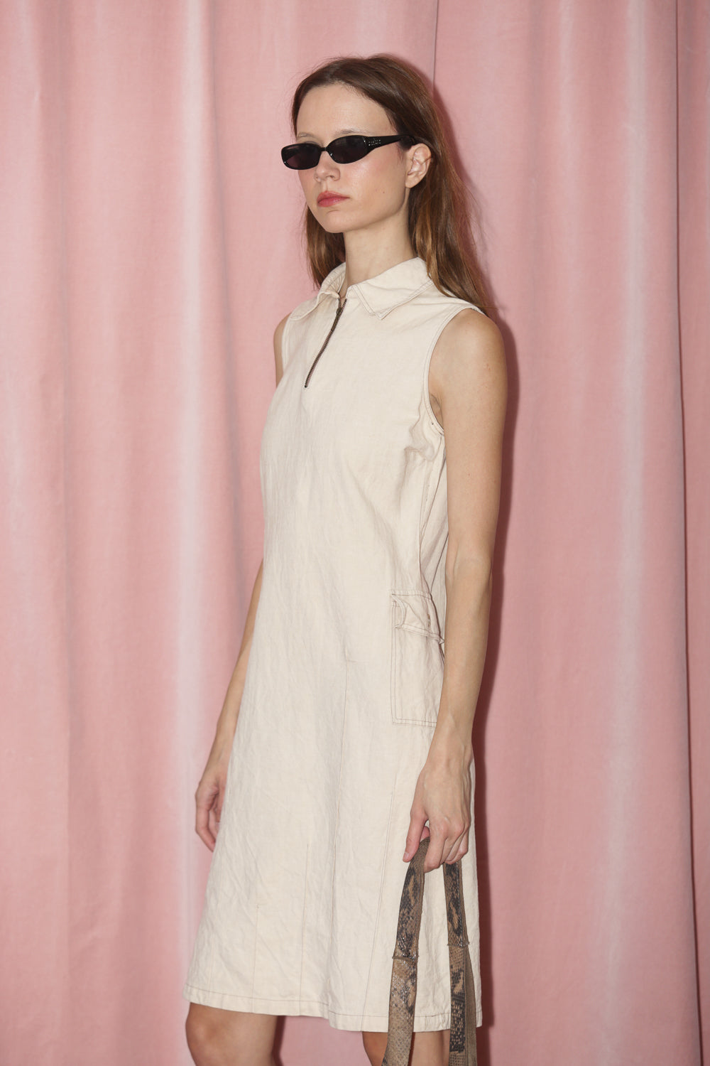 Vintage sleeveless midi dress. Collar detailing. Front top copper zipper along with back zipper closure. Side bottom outer pocket detailing. Relaxed fit.