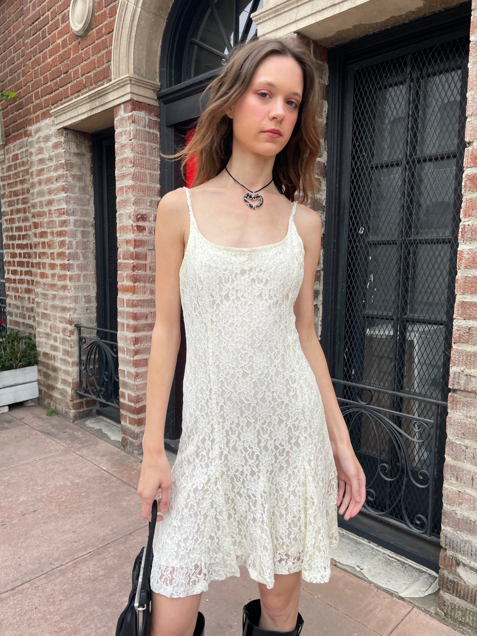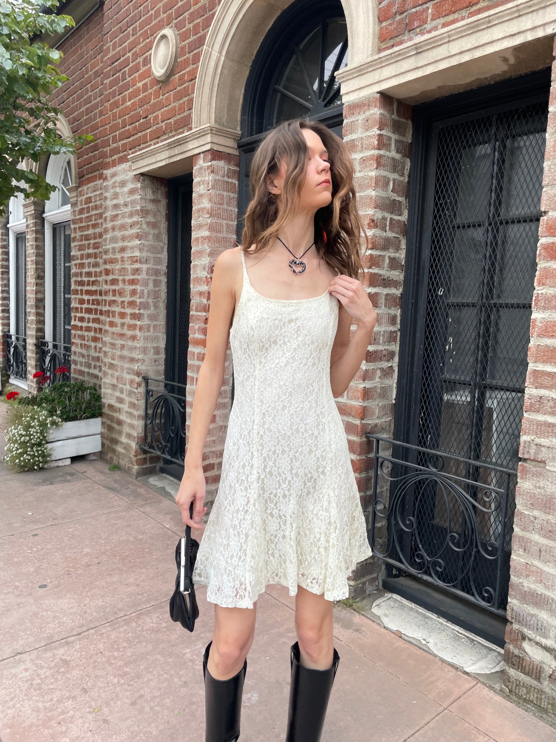 Vintage high neck lace dress. Ruffe short sleeve and bottom hem detail.