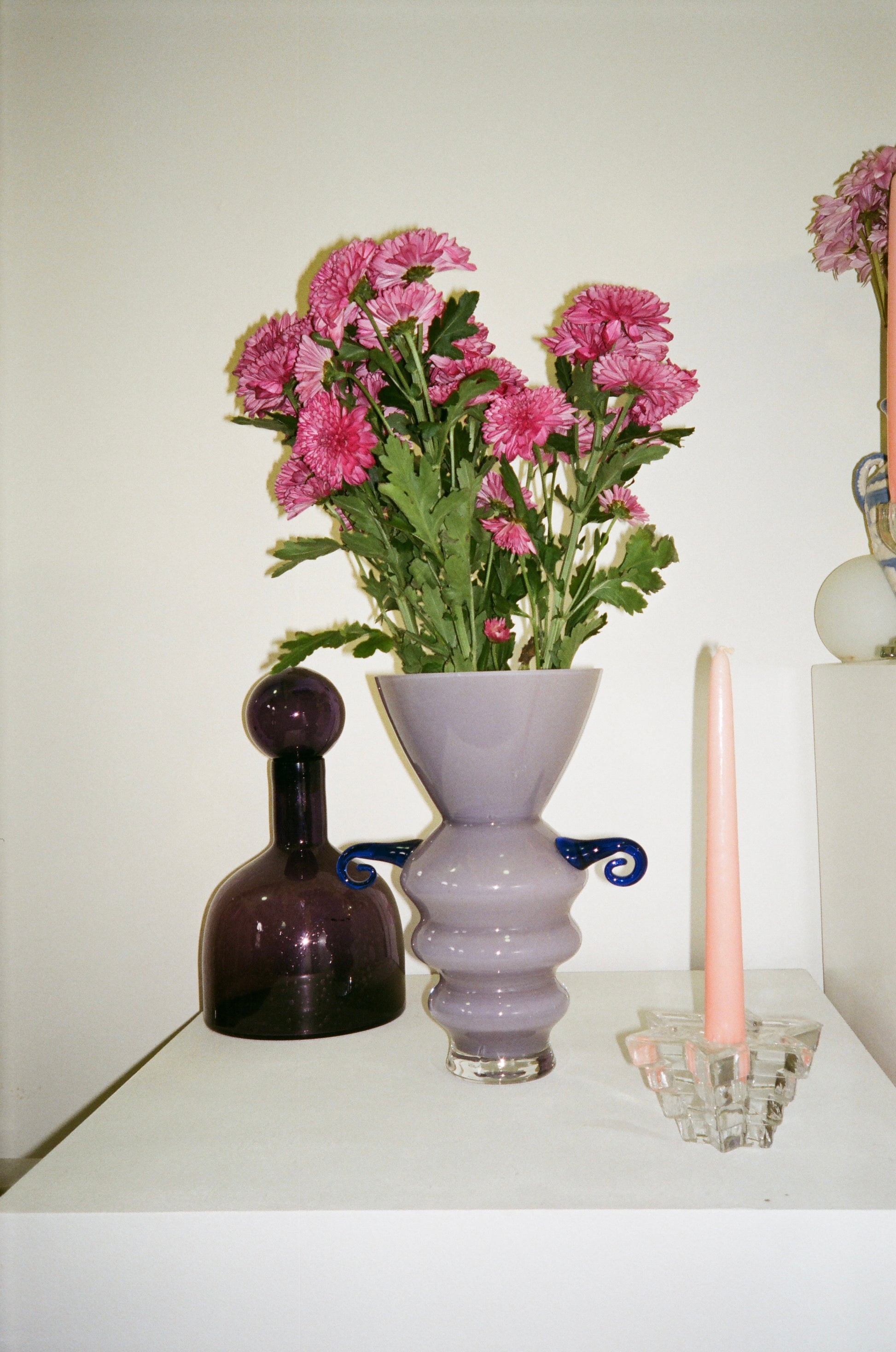 Violet glass vase features two sided spirals with a wavy bottom finishing resulting in a functional, beautiful hand blown glass piece to be admired and used as a floral vase or on it own. This vase was sourced from Pairs, France. Artist unknown. Part of our new in-store collection.