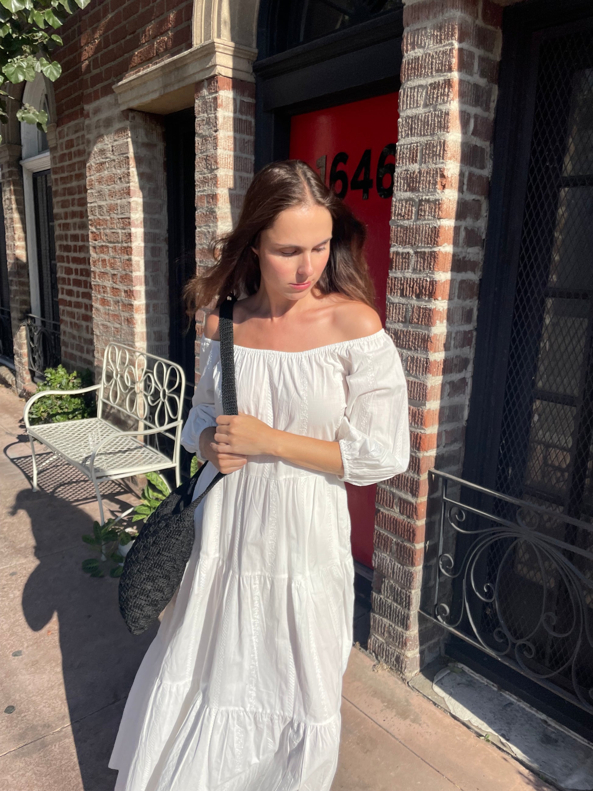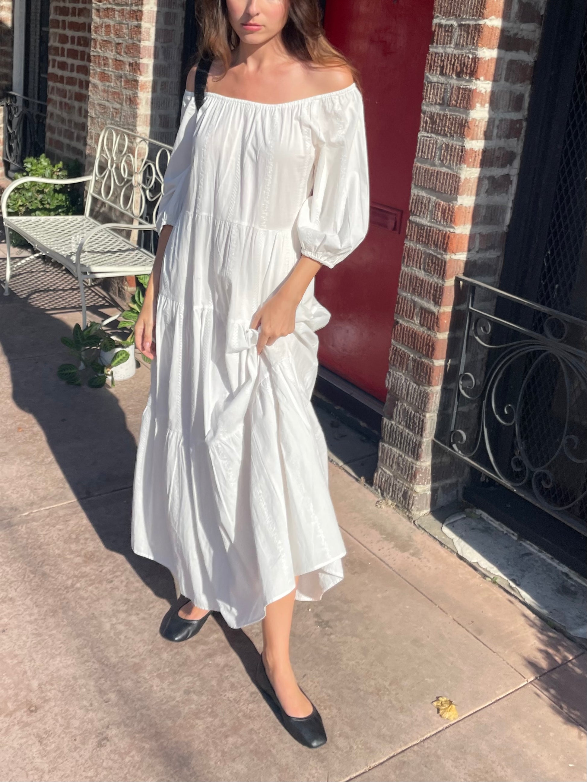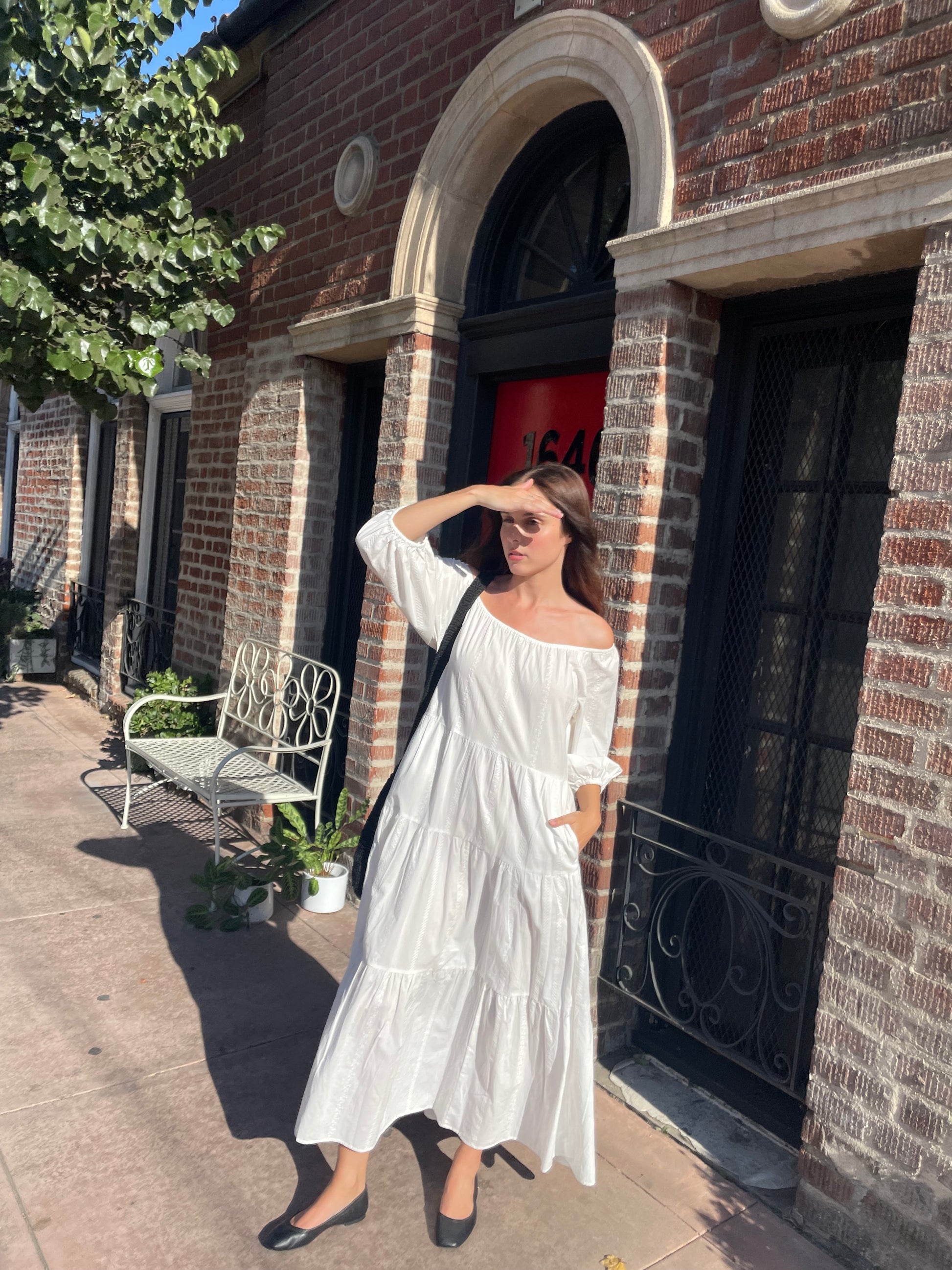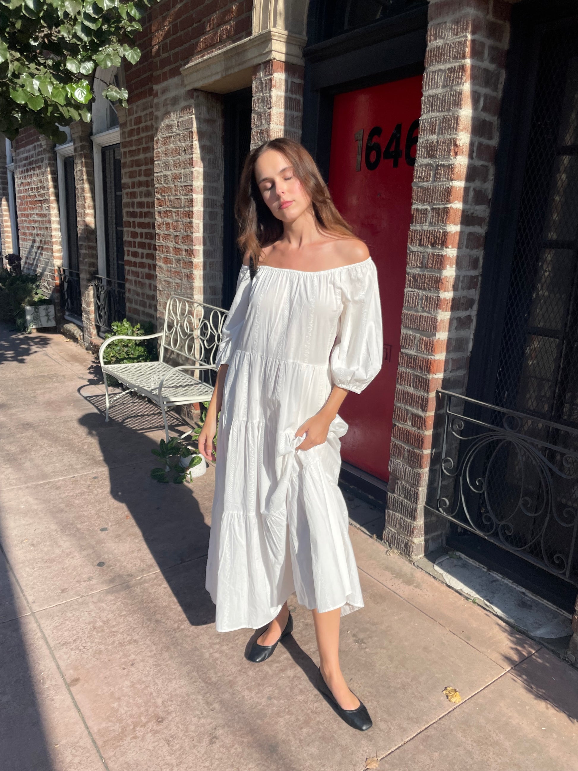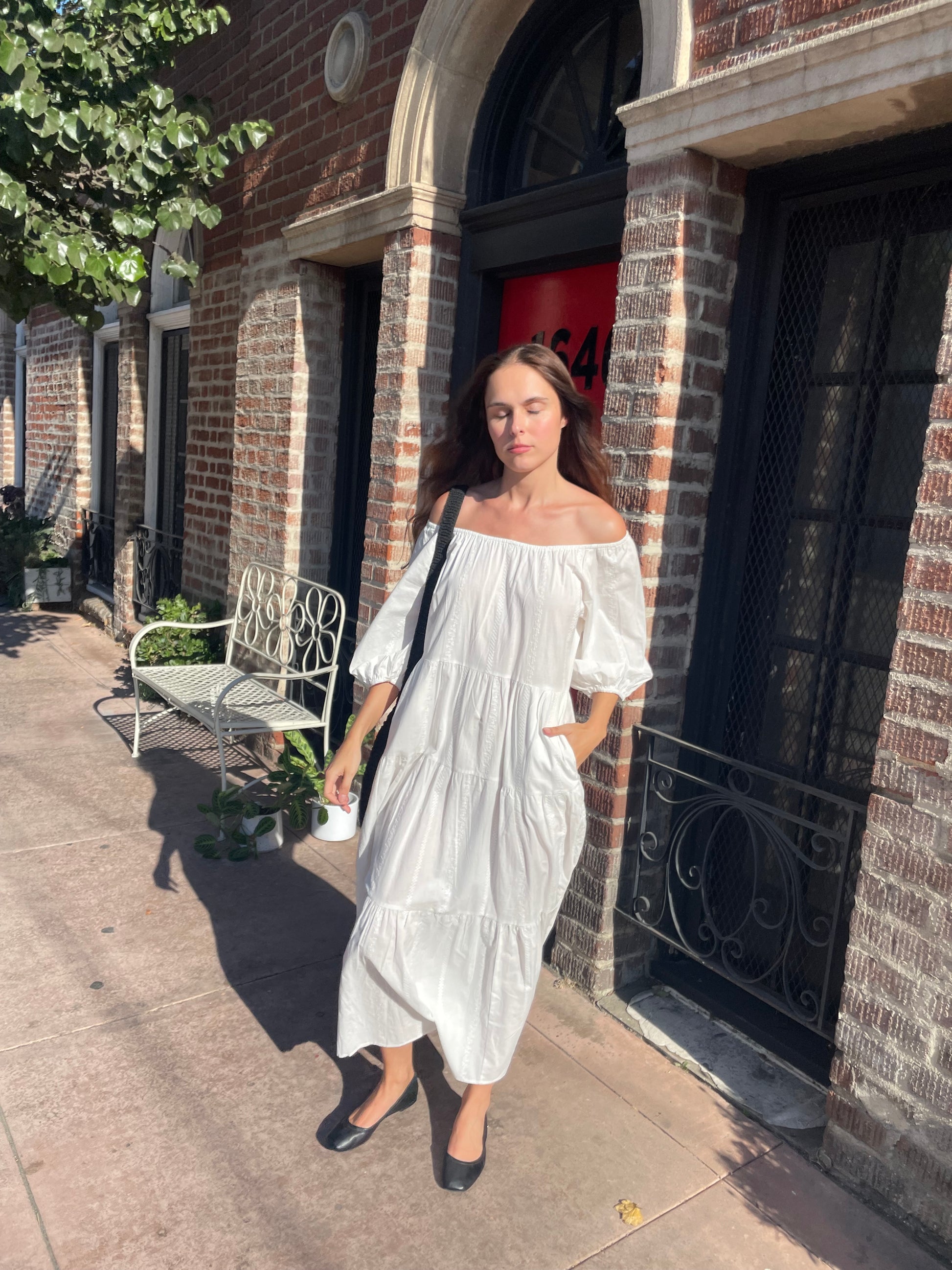 White off-the shoulder cotton slip dress. Feels light & floaty with an off-shoulder puff sleeve. Finished with a tiered flowy bottom. Relaxed flowy fit. With side slit pockets.