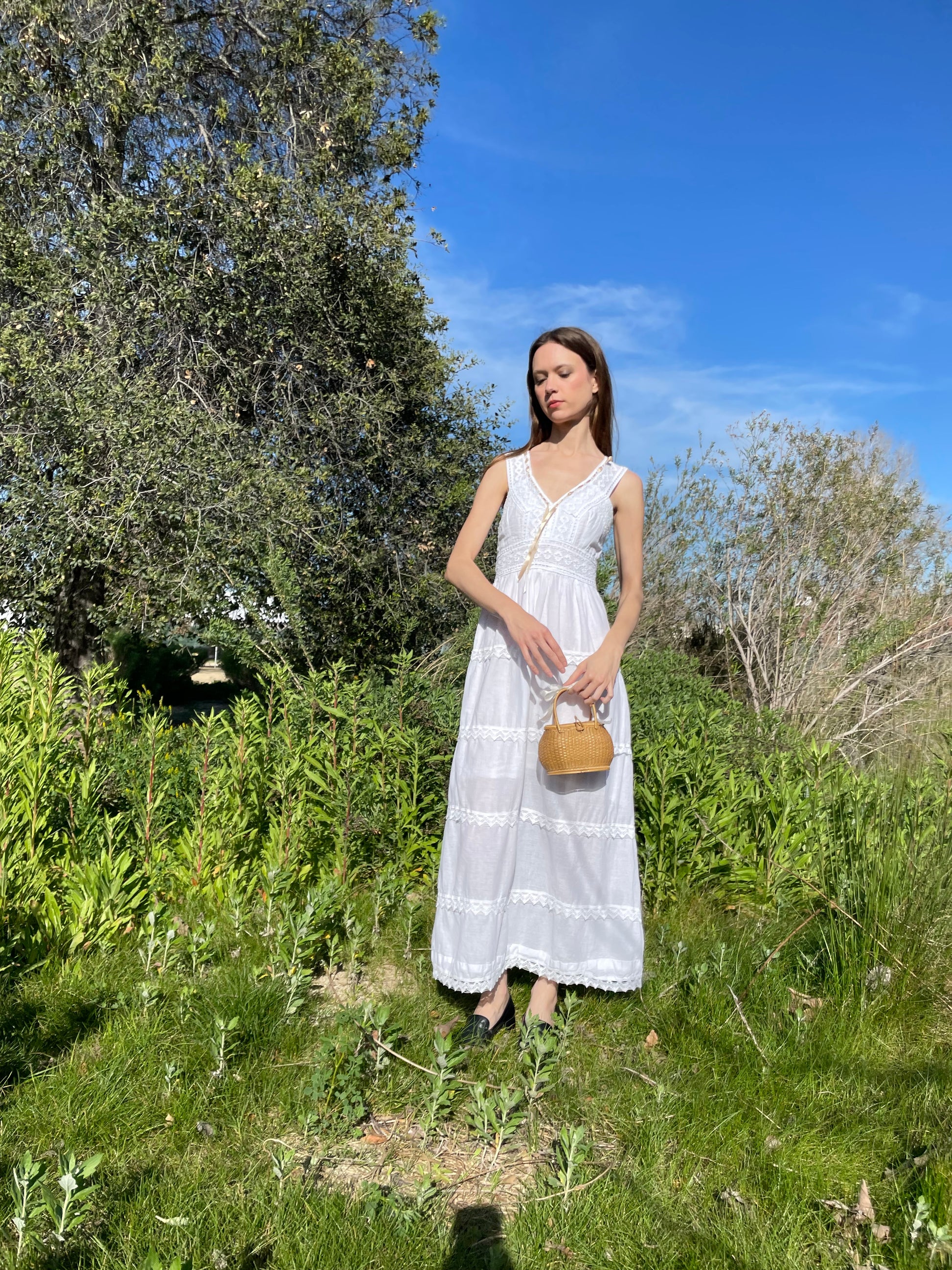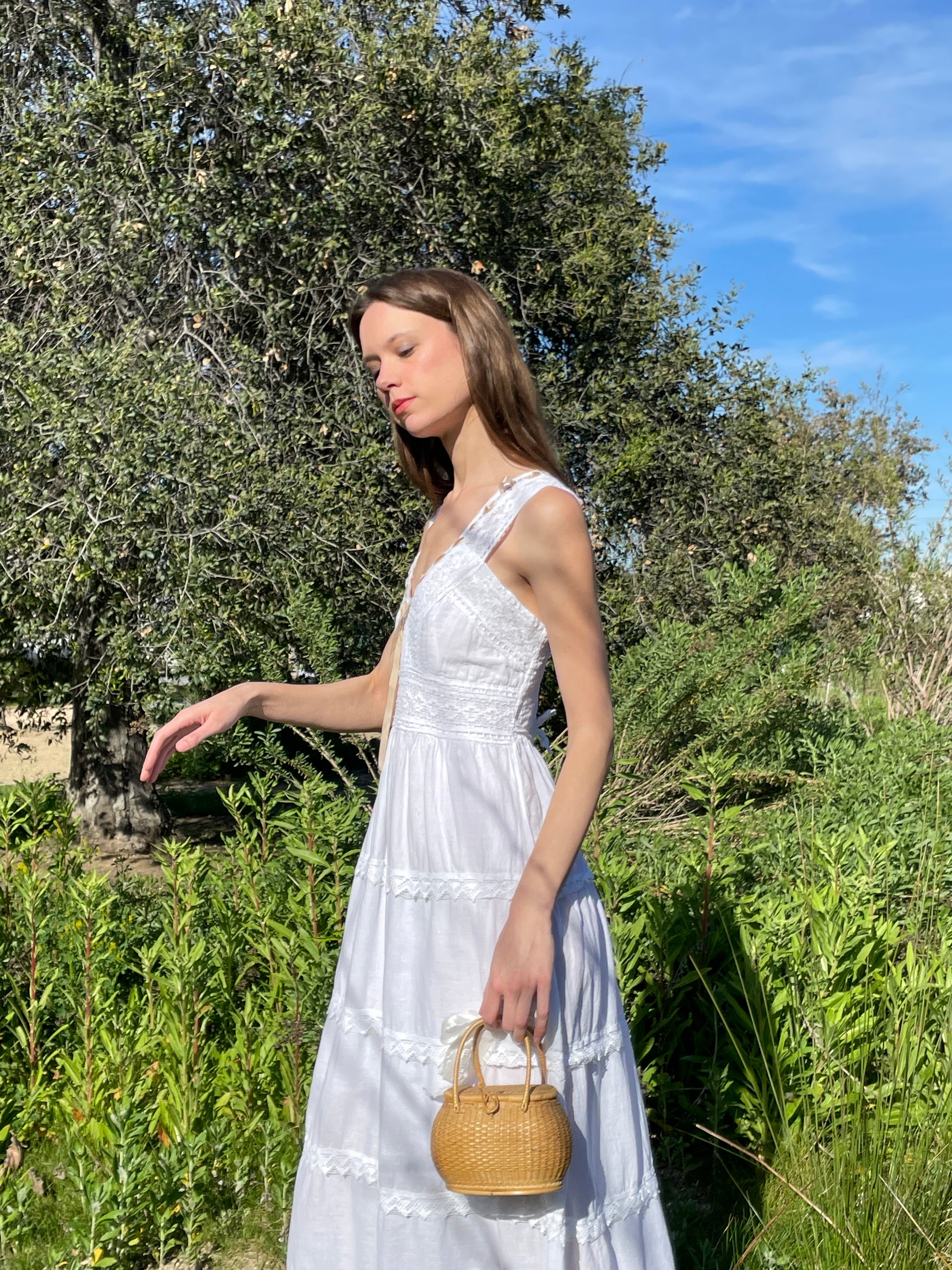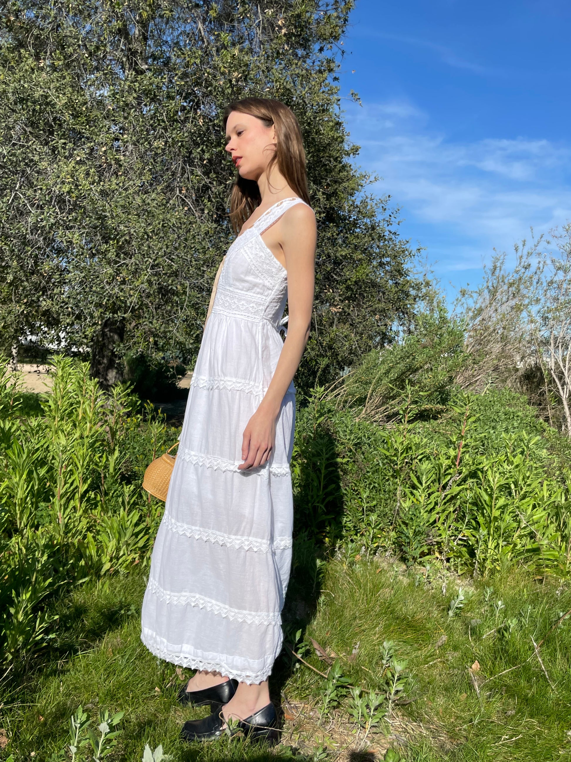 White cotton lace tiered dress. A vintage charm featuring a v neckline with a decorative tie. Ruffle trimming throughout. Cotton lace straps. Adjustable back bow tie. Relaxed fitted fit.